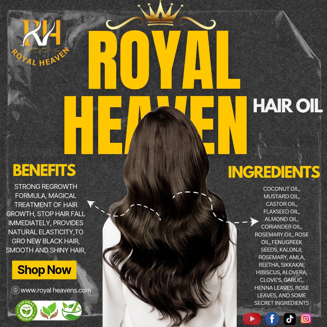 Discover the secret to stronger, shinier, and healthier hair with Royal Heaven Hair Oil — your all-natural solution for hair fall, dryness, and scalp issues. Infused with time-tested ingredients like coconut, castor, argan, amla